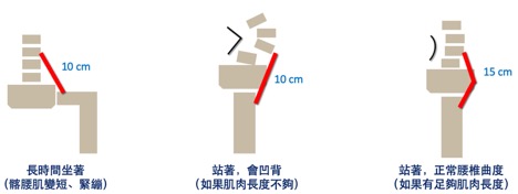 常見的例子是:現代人可能每天花6-7小時都是坐著的,這會讓我們在鼠蹊部的髂腰肌處在縮短的位置,日復一日,這條肌肉會變得比原先更縮短及緊繃。麻煩的是,假設髂腰肌原先有15公分,但在長時間久坐下,慢慢變成10公分,可是我們在站著時盡量要有15公分才能讓腰椎處在較舒服的姿勢,如果比15公分短,就會使腰椎被迫往前拉(下背過凹、類似翹屁股),若長時間以這個姿勢站立,腰部肌肉也會縮短而讓肌肉變得緊繃、痠痛。