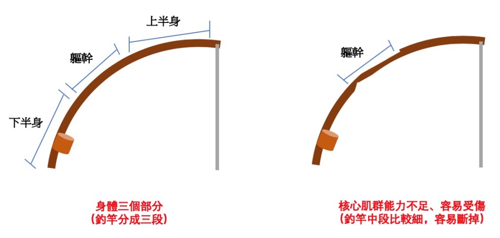 我們出力的位置是在手拿著下半段的尾端(下半身),上半段的尖端則是連著釣魚線要來對抗魚的拉力(上半身),而釣竿的中段(軀幹)要有足夠的韌性,同時保持彈性但不會彎曲到斷掉,但如果今天中斷的韌性不夠(代表著核心肌群及軀幹軟組織等的強度),同時又是受力最大的位置,就容易斷掉。