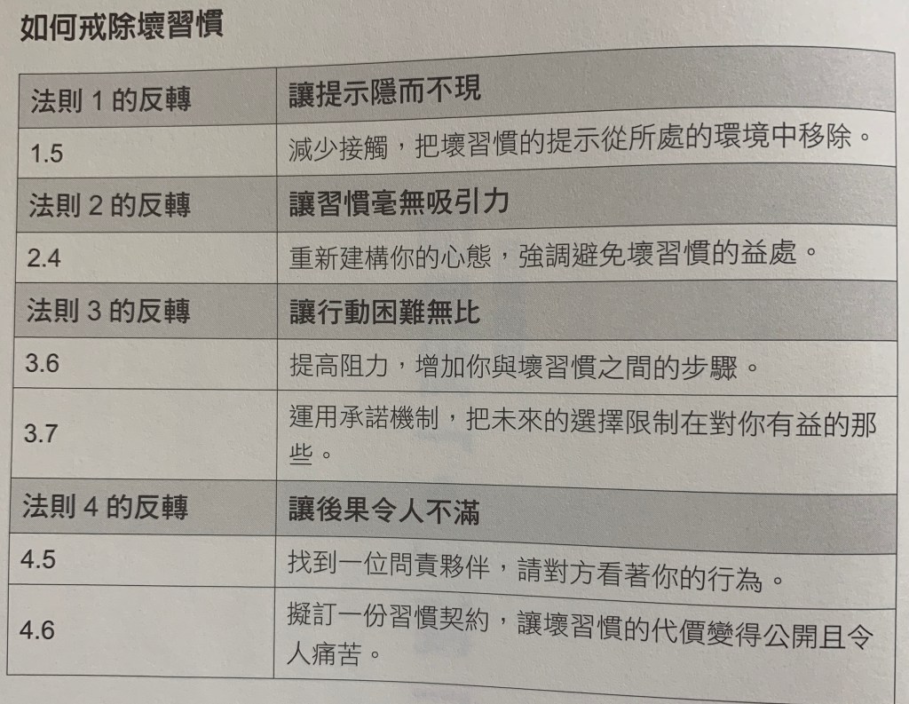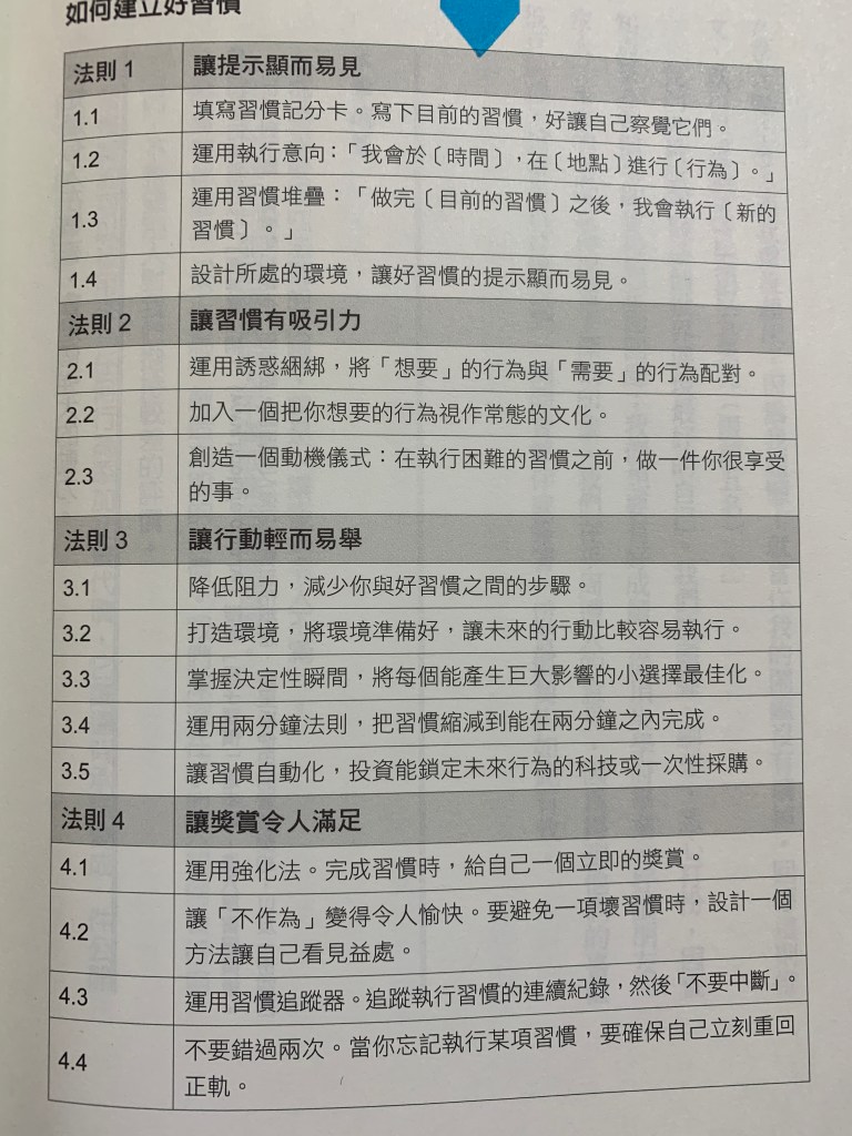 書中後半部就針對行為改變的四大法則做說明,包括讓提示顯而易見、讓習慣有吸引力、讓行動輕而易舉、讓獎賞令人滿足等,經由這些法則來建立好習慣,若要消除壞習慣就用相反的概念進行法則。