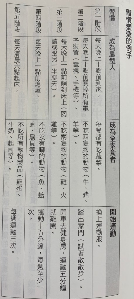 可以透過行為改變的四大法則,將自己想要改變的好壞習慣,帶入到原則裡面,並用實際的步驟去執行,起初也注意不要想說一次改變太多,因為難度越高,新的行為越難持續。