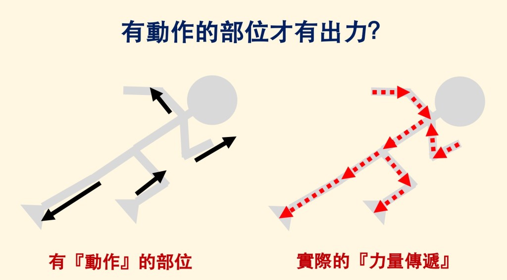 看似有在『動作』的部位,好像才是有在出力跟訓練。以跑步為例,起初多數人會認為就是腿跟手臂要出力擺動,軀幹是沒有出力的。以硬舉、蹲為例,初學時也會認為就是腿要夠有力,也較不會想到其他部位的影響。