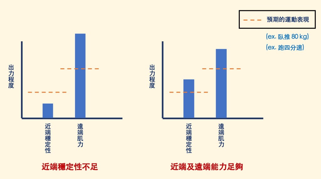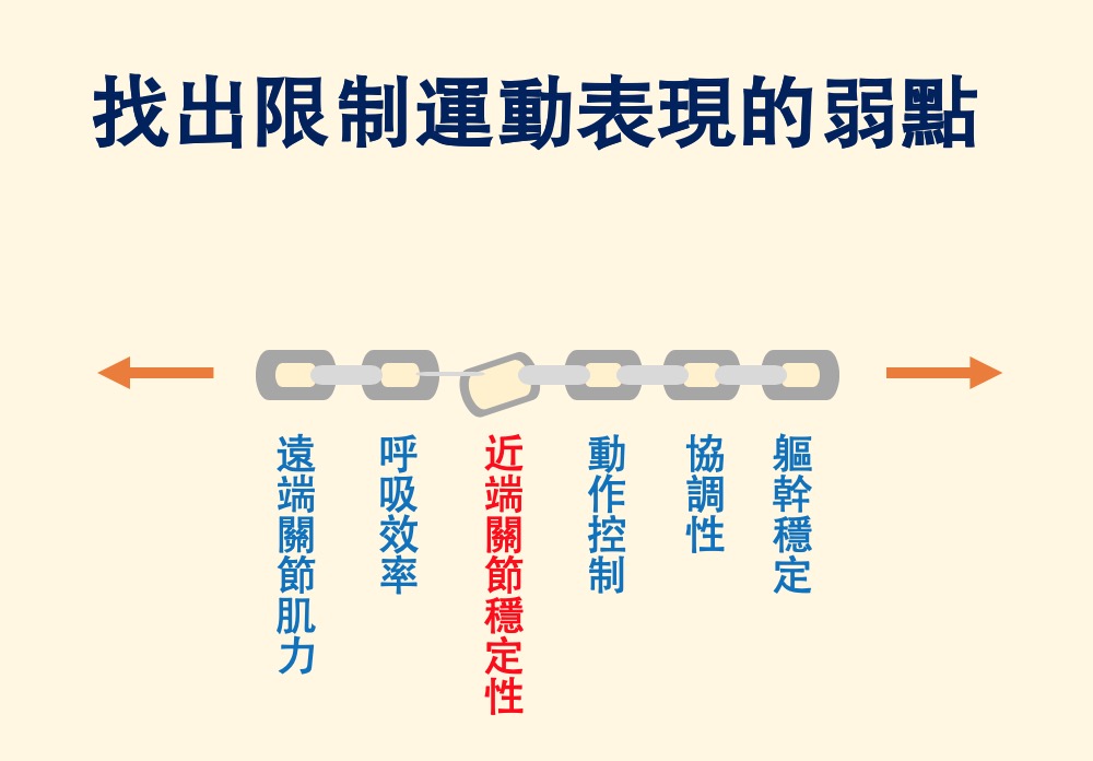 以運動表現來說,遠端關節最終能產生的力,時常取決於近端關節能不能穩定、有效傳遞力量。換句話說,能有產生最大的力量或好的運動表現會受限於『近端關節的穩定度』,更精準的詞,會是『限制因素』(limiting factor),也就是在這個因素沒有提升前,整體表現是沒辦法進步的。