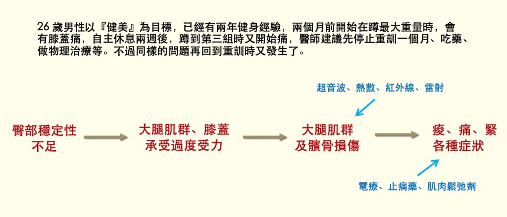 以運動傷害來說,不管是膝蓋、腳疼痛等問題,常常是因為臀部肌群的穩定性、肌力不足,而間接造成膝蓋或足底的受力更大、或需要肌肉更努力的出力來維持穩定。