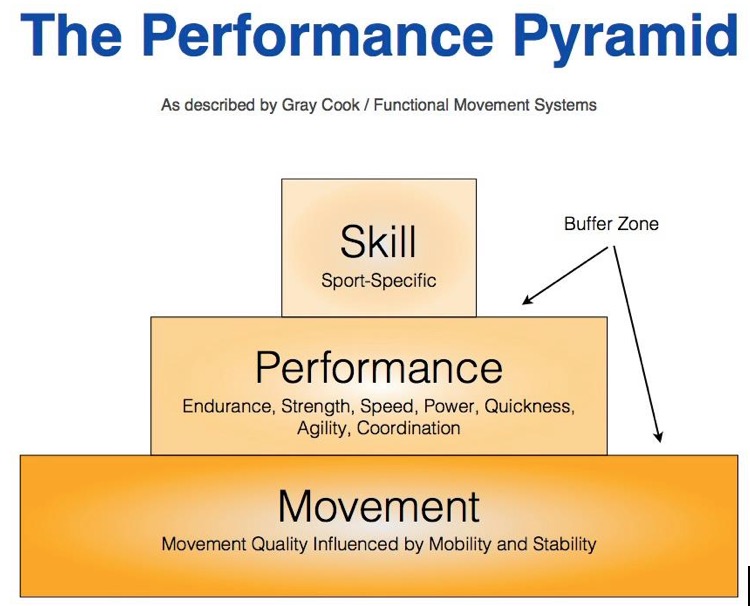 實際的運動表現及技術受到基礎動作能力非常大的影響,深厚的基礎能力能確保運動表現及技術的提升,如果發現自己在技術上都沒什麼進步或時常受傷,或許代表著已經達到基礎能力及運動表現的極限,要先加強金字塔中的最底層,才能讓最高層的部分繼續提升。