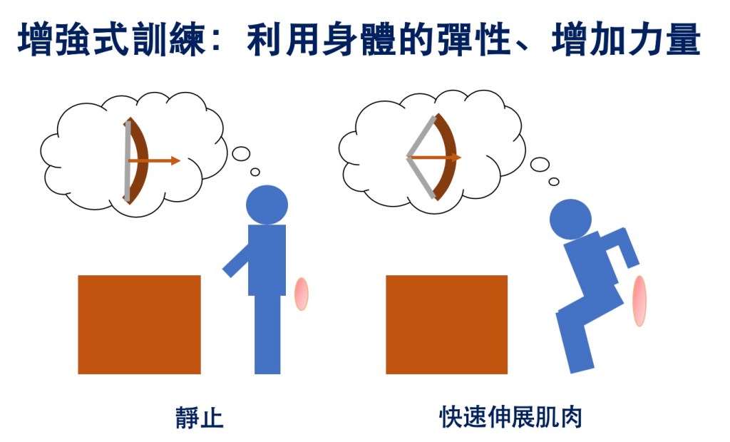 或者,如果要跳得夠高(力量)除了肌肉要主動用力,另外也會利用到肌肉的彈性(先拉長再用力)。所以力量輸出的總和等於肌肉主動收縮加上肌肉的彈性,但如果膝關節的活動度或大腿肌群的柔軟度不足(活動度),就會造成肌肉無法伸展開來、不能用到彈性,而導致跳的高度也下降(力量)。
