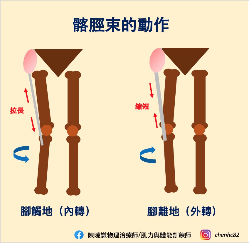 可以看一下自己的跑姿、走路的動作,腳在著地時膝蓋會往內(轉),而離地時會往外(轉),這個內外轉的動作會讓髂脛束拉長及縮短。