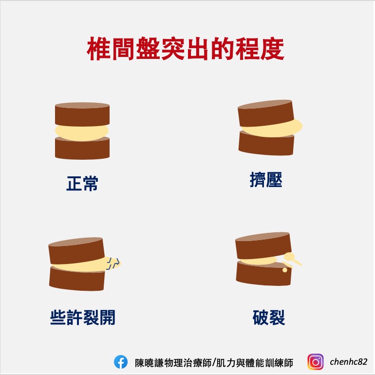 把椎間盤想像成一顆水球,『隨著壓力增加,起初水球會變扁、形變、被撐開、最後爆開』,上述過程就是輕度到重度椎間盤突出,到最後椎間盤破裂的過程