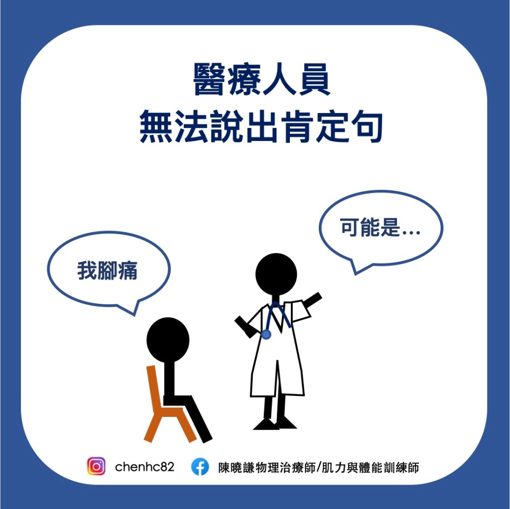 醫療人員的目的是判斷可能性最高的因子、篩掉機率最低的因素,並針對最有可能的因素去做處理,因此在解釋上並不會用肯定語氣。例如檢查後,發現病患平時沒有運動習慣,但整天都要穿著高跟鞋,導致小腿肌群較緊繃,醫療人員會說:『小腿肌肉太緊可能是造成足底筋膜炎很大的原因,但其他因素也有影響』。
