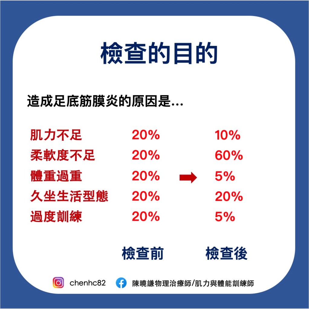 然而,有很多因素都可能造成單一個問題或疾病,我們稱之為危險因子(risk factor)。但也因為不同因素都能造成影響,所以在解釋上會比較保守,並不會說一定是哪個原因或因素造成現在的問題,例如足底筋膜炎的危險因子包括:肥胖、肌力不足、柔軟度不足、運動量過高、久坐生活等。
