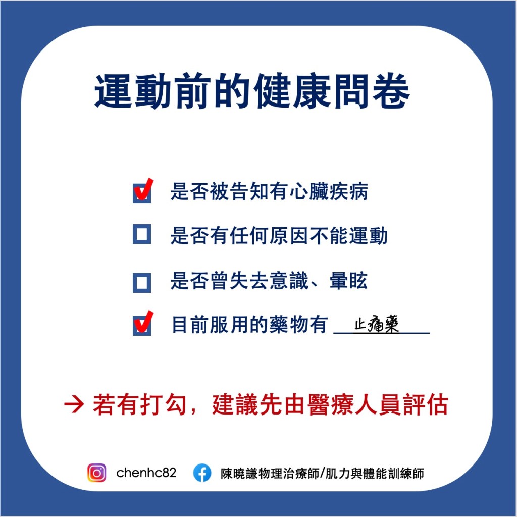其實在從事任何運動前,建議先找醫療人員評估身體是否有任何隱疾或問題,確定沒有或不影響下,再開始找專業運動訓練人員進行。在美國高中唸書時,為了參加網球校隊的甄選,學校會先規定你要繳交一張稱為金卡(Gold card)的證明,是要讓你去找家庭醫師做健康檢查、問卷篩檢等,並在醫師確認後簽名、註記你可以參與學校的運動校隊。其實這類的健康問卷調查,都建議在執行運動訓練前先由醫療人員評估看看。