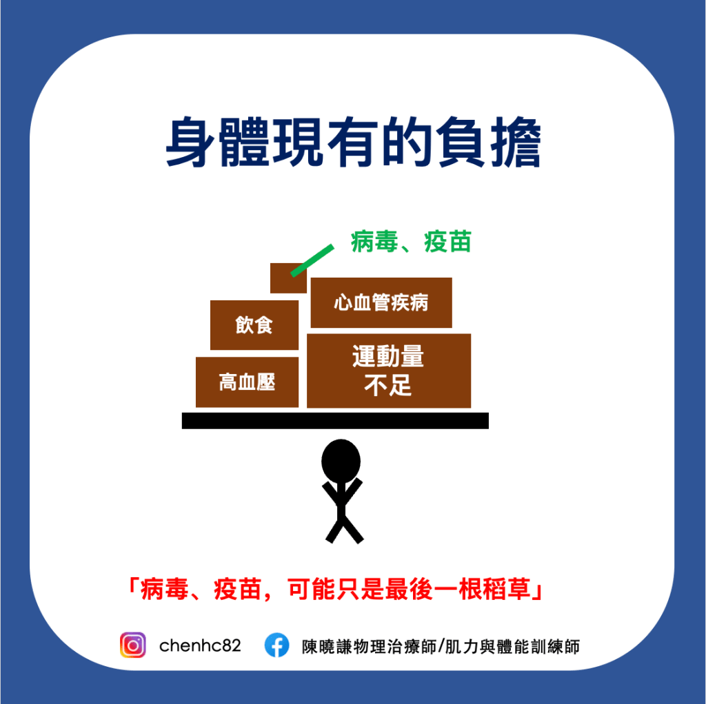 身體能力有很大部分取決於「給身體的刺激」。平時有運動的習慣,就是適當的刺激,能讓身體變得更強壯,迎接更多、更大的刺激。我覺得不管是疾病或病毒,就是在考驗我們的身體有沒有準備好,就像唸書準備考試一樣。因此,身體的能力就像儲蓄一樣,儘管遇到金融危機,也能因為平時的儲蓄撐過一段時間,但如果沒有,任何一個負擔就是最後一根稻草。