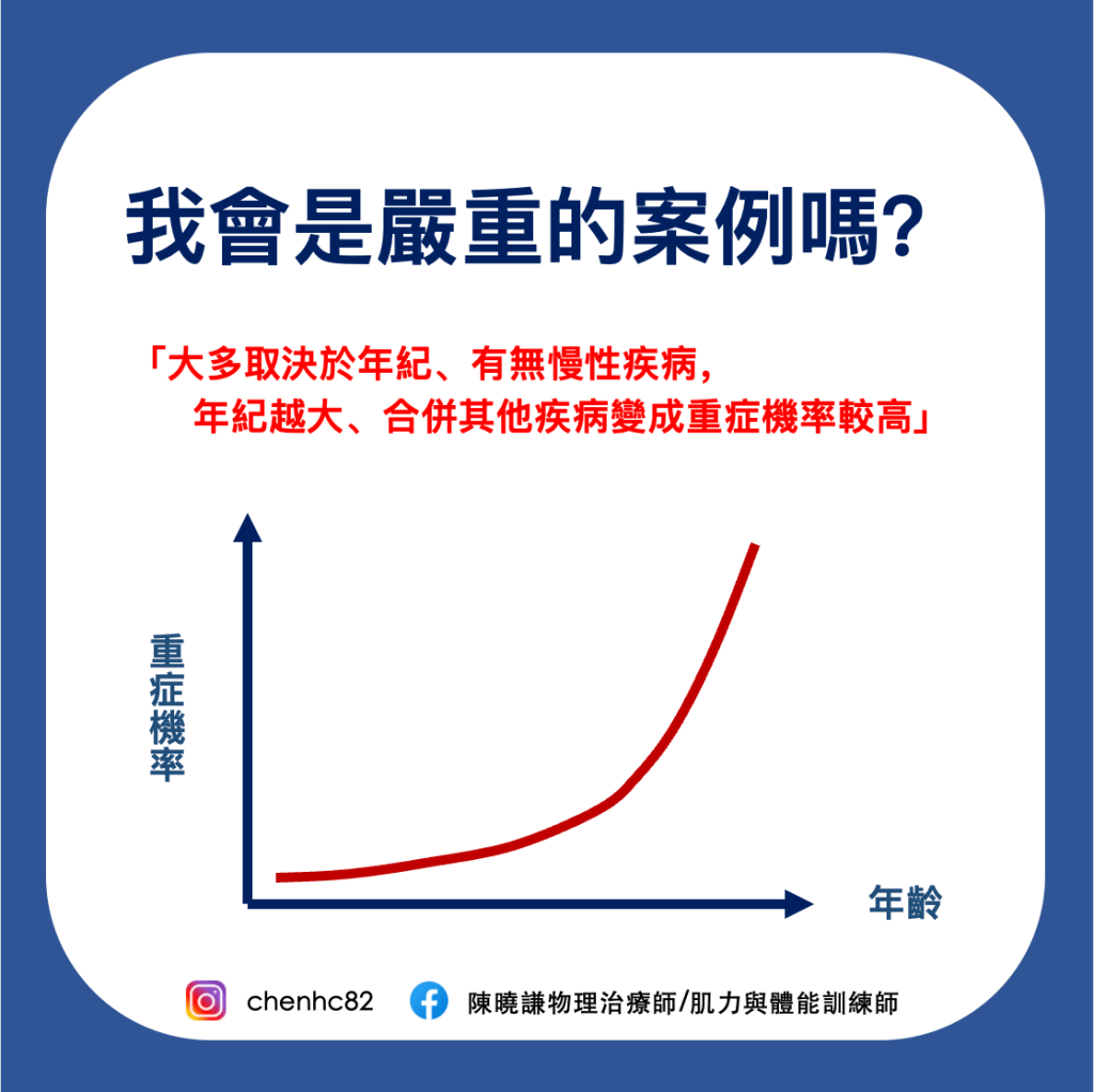 這次的死亡案例多是「年紀大、有慢性疾病」,其實不僅限於新冠病毒而已。多數的疾病不管是肺炎、心血管疾病等,也是因為這些因素會有較高的死亡率。大家會說「年紀大是不能控制的,因為人終究會老」,但是可以控制的是「年紀大時伴隨的生活型態」,例如能坐電梯就不走樓梯,能坐車就不走路,因為年紀大了就要有年紀大的樣子。我想表達的是,年長的衰弱、退化,當然有部分是來自「年紀」,但「運動量不足」大概也佔了一半的程度。相較於每天規律運動的長者、跟都待在家裡不出門的長者,身體的能力差異甚大。