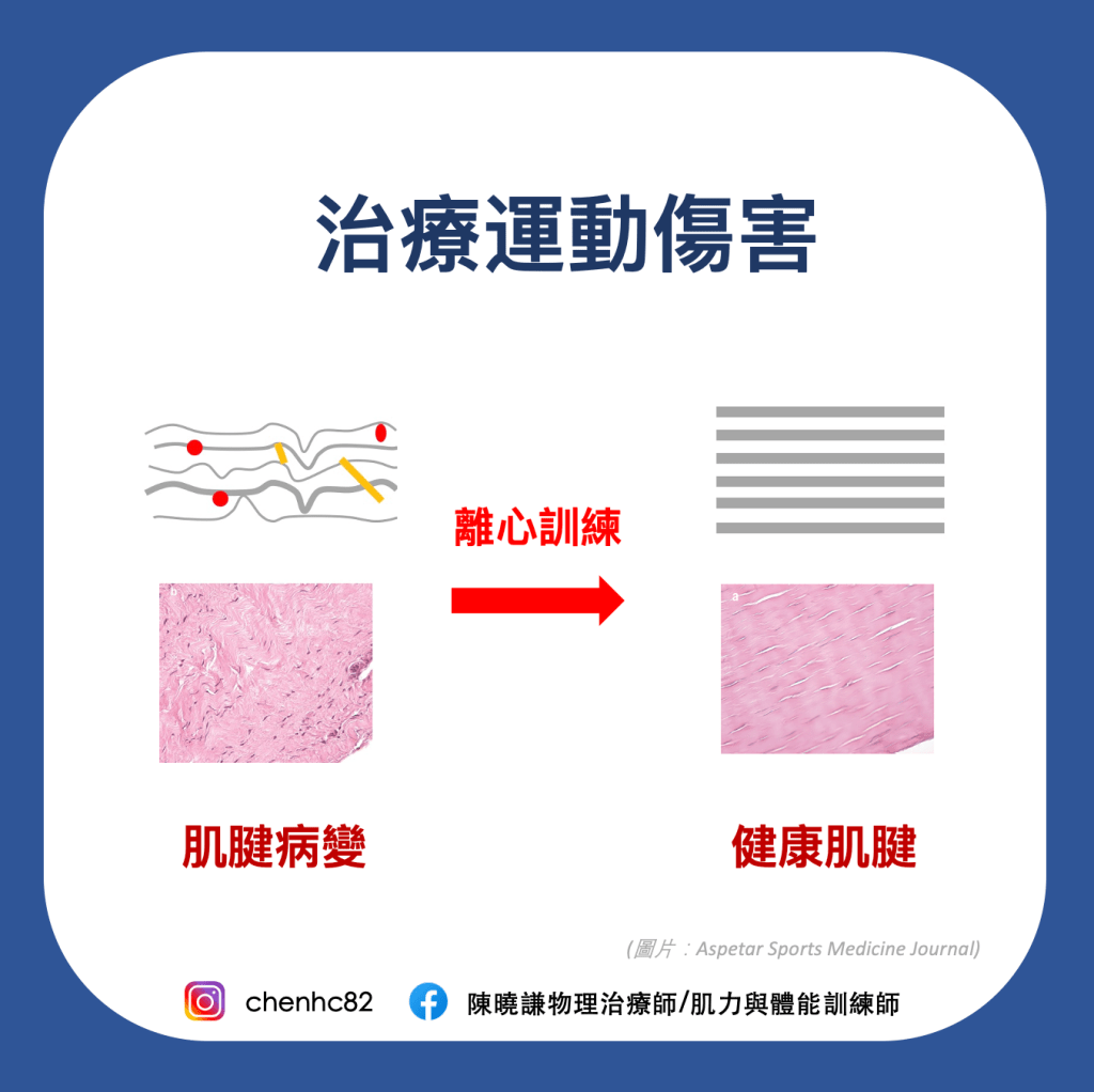以阿基里斯肌腱炎(Achilles tendinopathy)來說,對應的訓練為單腳墊腳尖並緩緩地落下,或者髕骨肌腱炎(Patellar tendinopathy),可能是透過分腿蹲、單腳蹲,同樣著重在緩慢地下降。