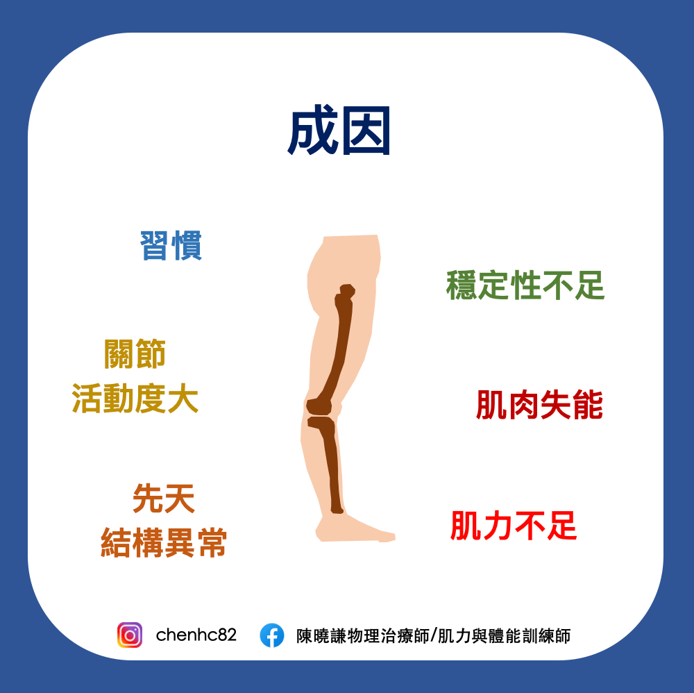 這常出現在一些女性,有非常好的柔軟度、關節活動度,但沒有足夠的肌力或關節穩定性維持較好的膝蓋位置,因此在走路時、久站、甚至運動時,膝蓋會有「反折、過度伸直」的現象。