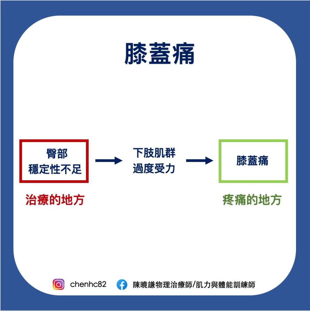 有許多膝蓋痛是來自臀部肌群穩定性不足所導致,可以想像成原本公司有三個人在工作,但一個人在偷懶(臀部),另外兩個人就過勞(膝蓋、腳踝等)。因此,當治療師評估膝蓋痛可能是臀部無力造成的,會透過運動治療來訓練臀部,若膝蓋本身有疼痛,也可以給予一些止痛的治療例如電療、消炎止痛藥。