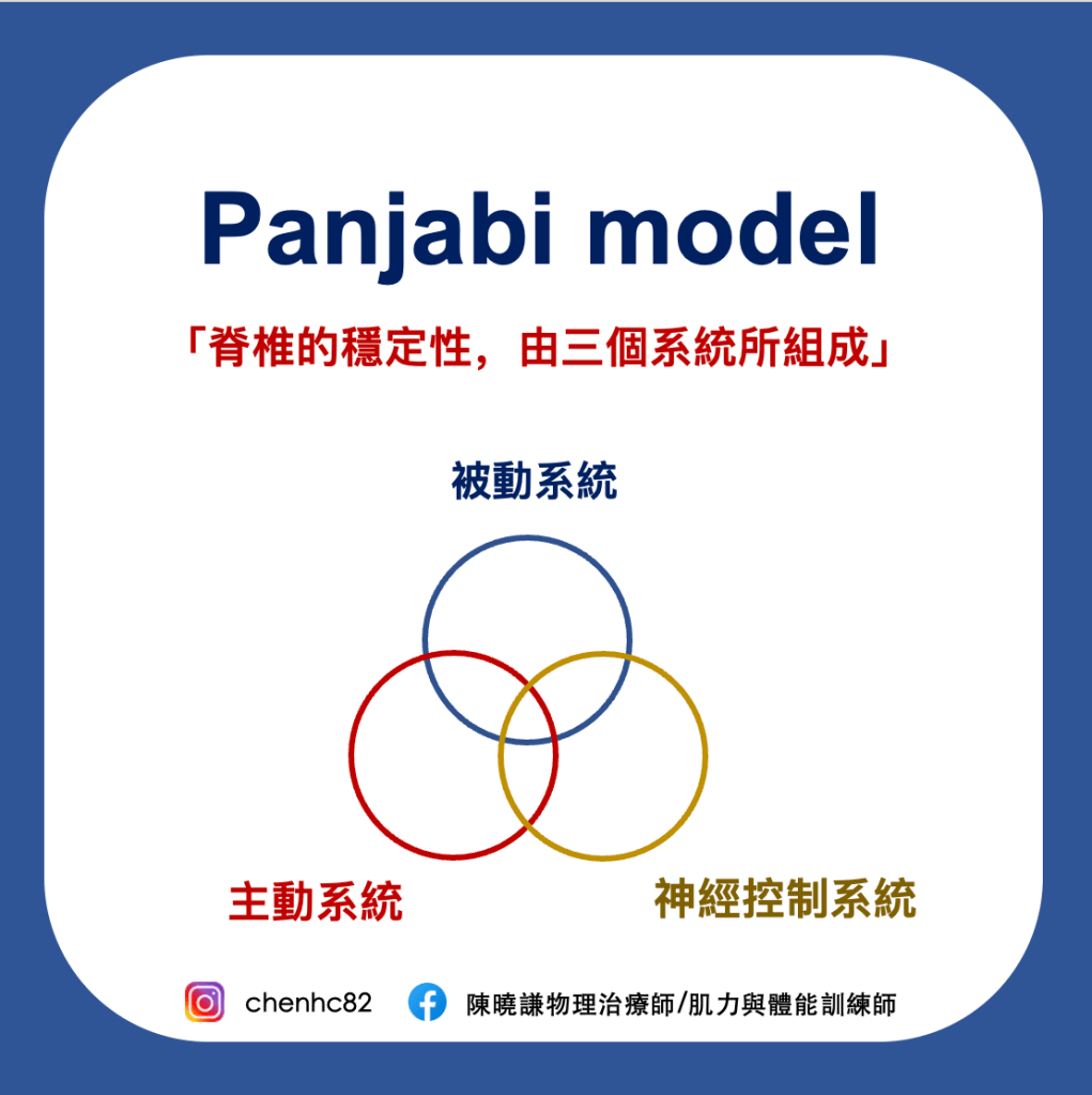 Panjabi model是在敘述「脊椎的穩定性,是由三個系統所組成,在訓練或治療時需同時考量進去」。我想這個理論可以應用在人體的各種動作,也就是所有動作都至少是由這三個系統「主動系統、被動系統、神經控制系統」三個要素所組成。