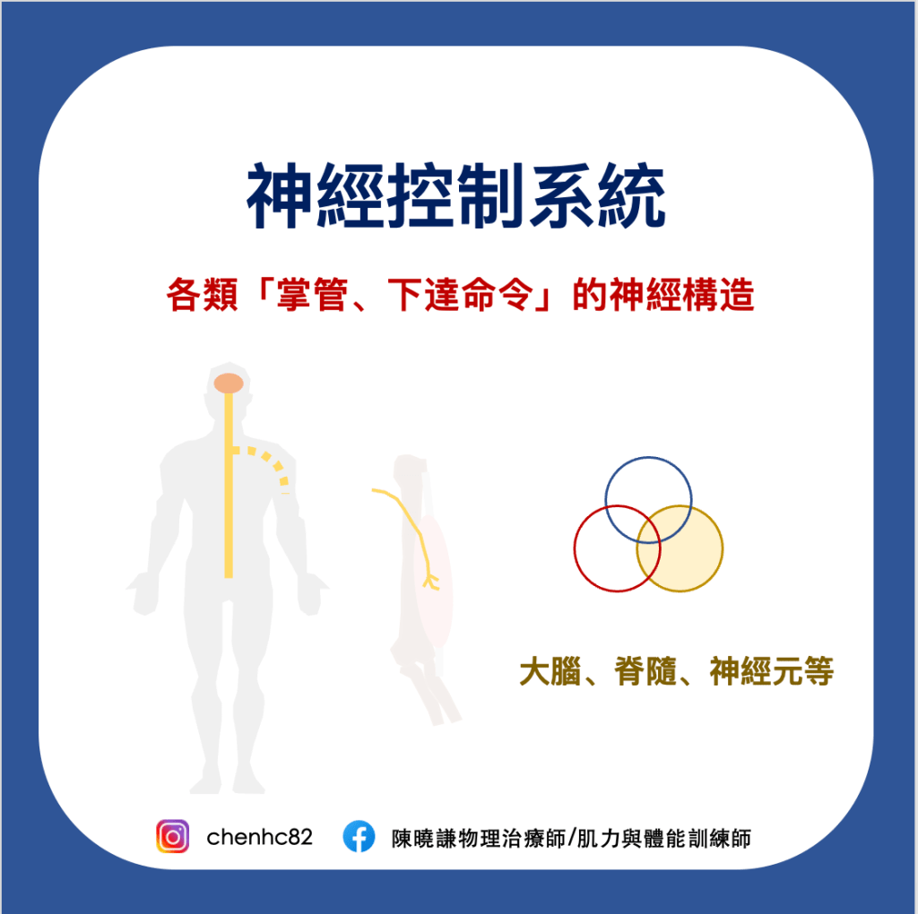 包括各類神經構造,例如大腦、脊髓、周邊神經等,負責「對肌肉下達命令」。例如在什麼時間該出力、出多少力、肌肉們出力的順序?同時可以接收其他兩個系統所傳來的訊息,調控身體位置及動作,例如腳踝周遭的關節跟肌肉感測到被過度拉扯,這個訊息被傳遞到神經控制系統後,會下達命令給肌肉說趕快收縮,來避免腳腫得跟包子一樣的狀況。
