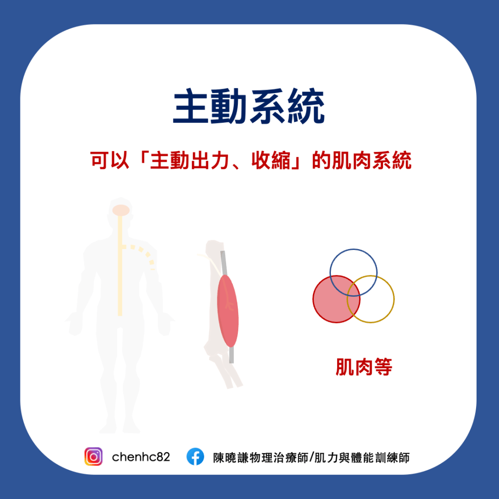 主要是肌肉,負責產生力量、動作等,與被動系統最大的差異是,肌肉是「可以主動產生收縮、動作的」,而被動系統如韌帶、骨頭等「不能自己主動產生,但可傳遞肌肉所產生的力」。