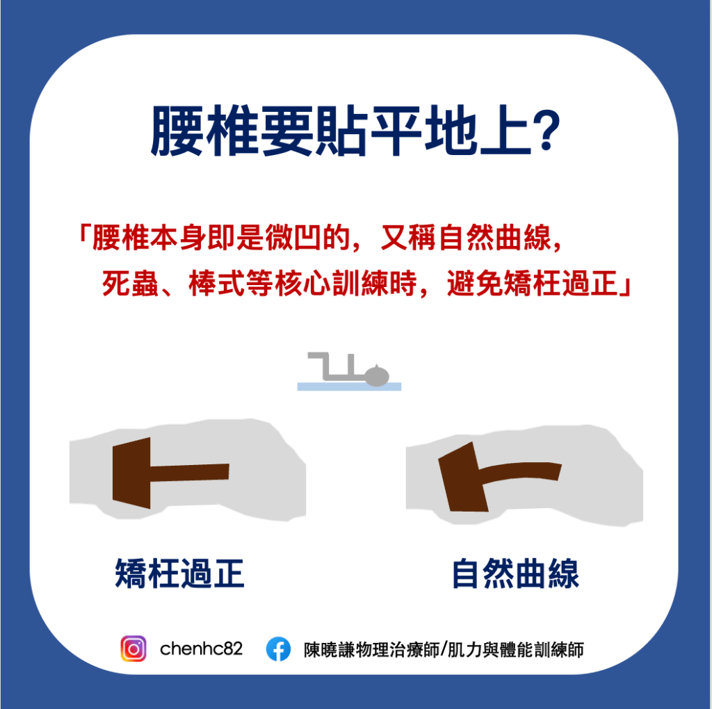 健身房裡常會聽到這類的口令,要把特定的身體部位例如腰、膝、腳穩定住,希望能減少運動傷害、並舉起更重的重量。這些善意的提醒,要注意是否變成「矯枉過正」。以最常見的棒式(plank)或死蟲(deadbug)為例,為了確保腹部肌群的使用,會說「腰不能過凹」或「腰跟地面不能有空隙」,但是,人體在最自然、最好發力的情況下,腰即是微凹的(natural lordosis),我們又稱為正中位置(neutral position)(可參考之前寫的文章:正中位置)