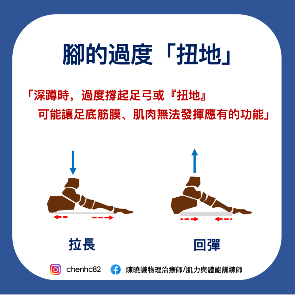 我們在日常生活跟運動中,從來不是「動一個部位,完全固定住其他部位」,深蹲時,把足弓維持在中間的位置,在蹲下去時,讓足弓適度往下沉,可以伸展到足底筋膜,而被拉長的足底筋膜儲存好能量,可以在站起的過程中,透過彈性讓足弓再次撐起。
