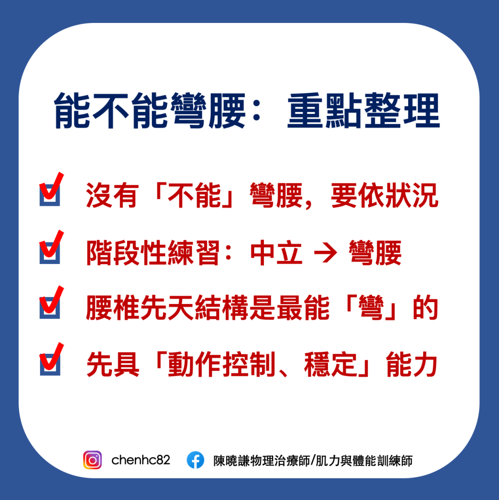 這個說法,最早應該是源自於「腰痛、腰受傷時,好像常跟彎腰有關」,而且很容易理解,因為身體往前彎就會讓身體後側的構造過度拉扯。然而,目前對下背痛(low back pain)的成因還是有很多的說法,包括:姿勢、動作控制、柔軟度、肌力、穩定性、先天結構等,我們只能說「彎腰」可能會、比較容易受傷,但不代表所有情況下是「不能彎腰的」,因為這並不符合我們的日常需求,例如我們還是要蹲馬桶、把地上的筆撿起來等