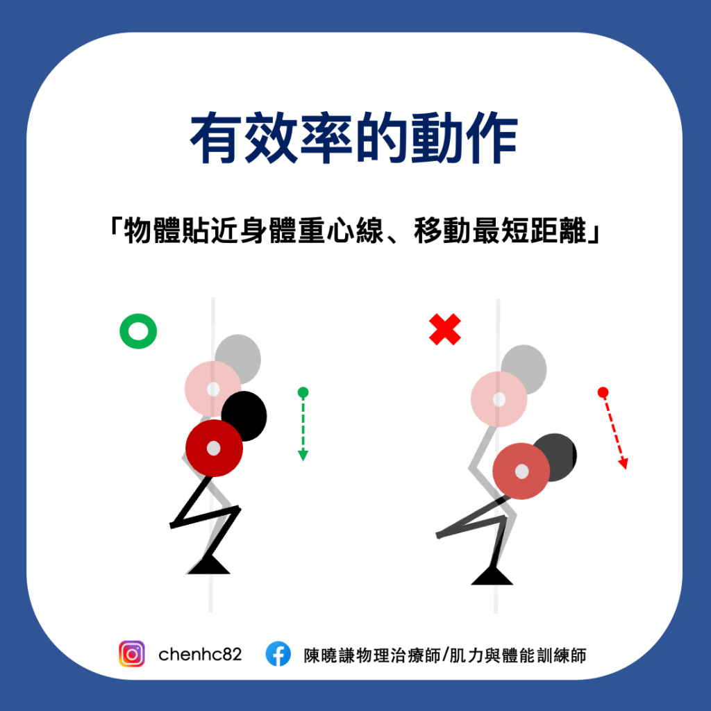 要舉起最大的重量、或最有效率的移動,必須讓「物體最重的位置,跟身體的重心線越靠近越好」,若以背槓深蹲來說,即是要讓槓的移動軌跡,能沿著身體的重心線移動,也就是肩膀要保持在足弓的正上方移動。若讓身體移動的軌跡有偏離重心線,可能會讓身體特定一側施力較多、甚至失去平衡。當膝蓋不能超過腳尖時,時常會導致重心偏後,快要往後倒的感覺,同時槓鈴移動的軌跡也變得不是直上直下。