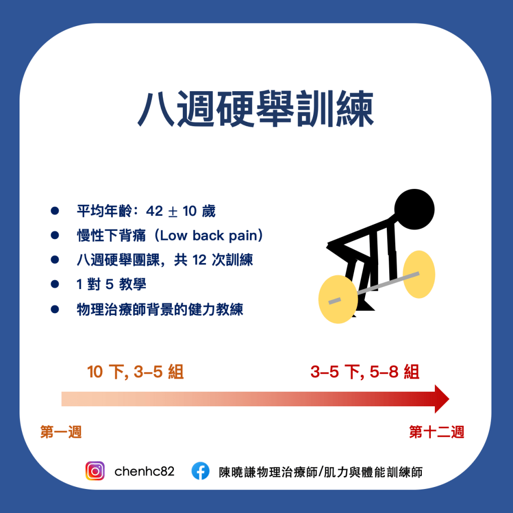 我後來從一篇研究中,看到類似的趨勢,一群平均年齡在40歲有慢性下背痛的個案,不曾有重量訓練的經驗,上了為期8週的12次硬舉課程(1對5團課,每次1小時),只做槓鈴硬舉,從剛開始3-5組10下,逐漸變成5-8組3-5下的課表