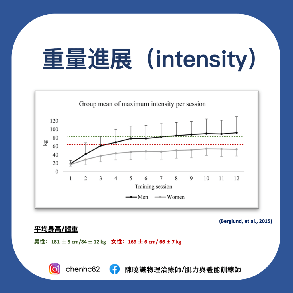 雖然我們不是健力專項,需要追求「最大重量」,但在「逐漸增加重量」是必要的,因為隨著訓練,身體會逐漸進步,也需要更大的刺激才能讓身體「持續進步」,又稱為「超負荷(Overload)」原則。但也不要盲目地增加重量,需觀察「動作品質、身體恢復的狀況、是否有疼痛或其他症狀」等。若有健康問題、結構損傷,則因人而異、彈性地調整課表,只要能確保是有進步的。