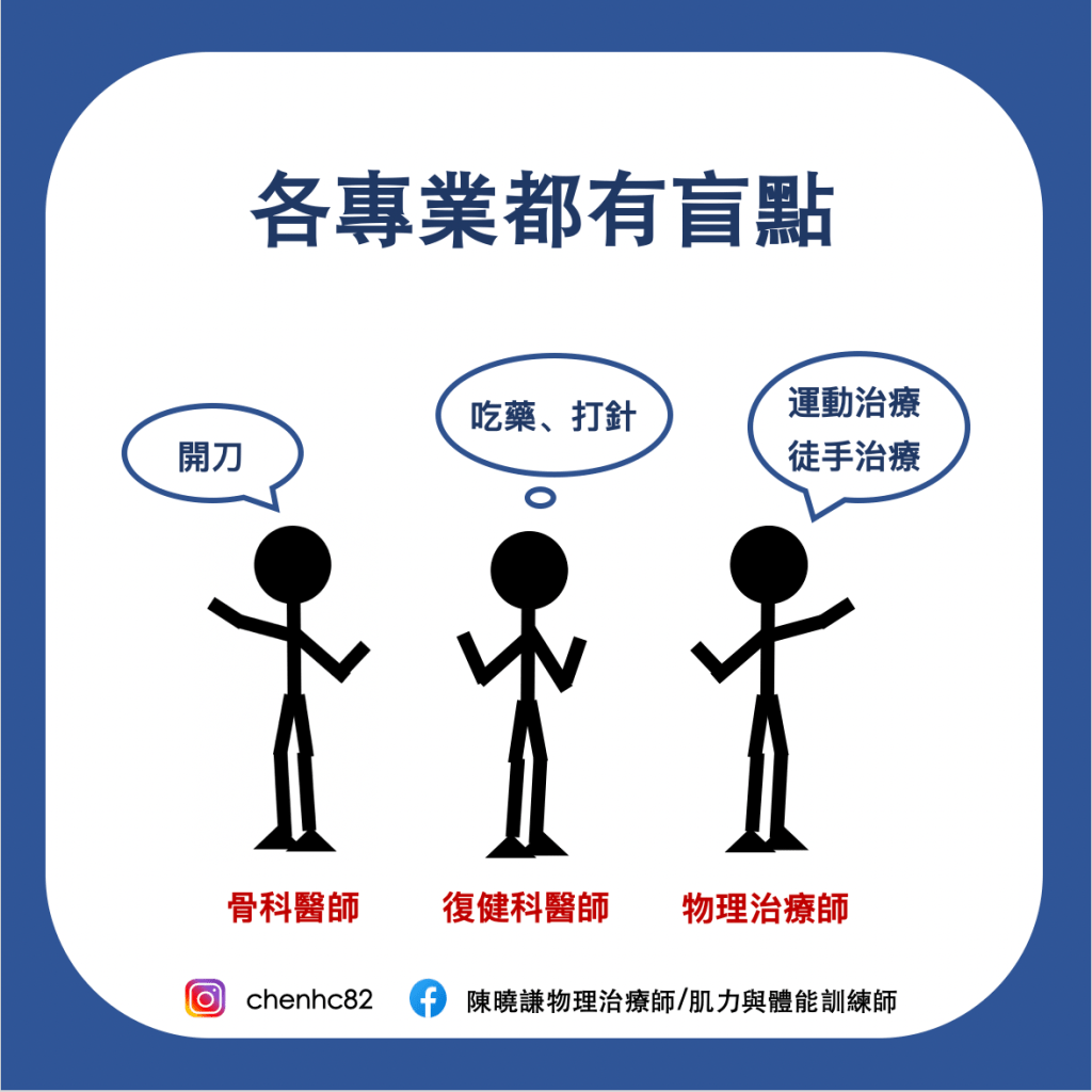 每個專科例如心臟外科、骨科都需要數年來養成,優點是能專攻在自己擅長的領域,缺點是容易只用自己的角度、領域去處理問題。因此,同樣的一個問題,骨科醫師可能用手術、物理治療師可能用運動或徒手治療、復健科醫師可能用注射,重點是找到效果最好、副作用最少的治療方式。