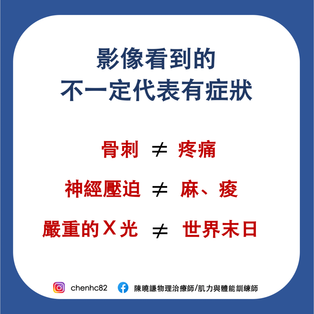 許多情況下,影像所見到的問題不見得跟疼痛有關聯,意思是說核磁共振上顯示椎間盤突出,但疼痛有可能不是椎間盤造成的,因此詳盡地跟醫師討論並確認疼痛的來源很重要,例如透過動作檢測、理學檢查等釐清,並非單一只用影像學作為依據。