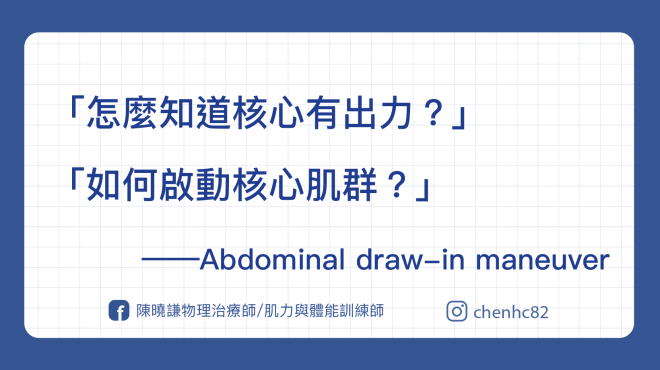 下面介紹的,是學習核心出力的其中一種方式,稱為Abdominal Draw-in Maneuver,常用來活化腹部深層的肌群,例如腹橫肌(Transverse abdominis)等,來減少下背痛、痠痛跟提升運動表現。