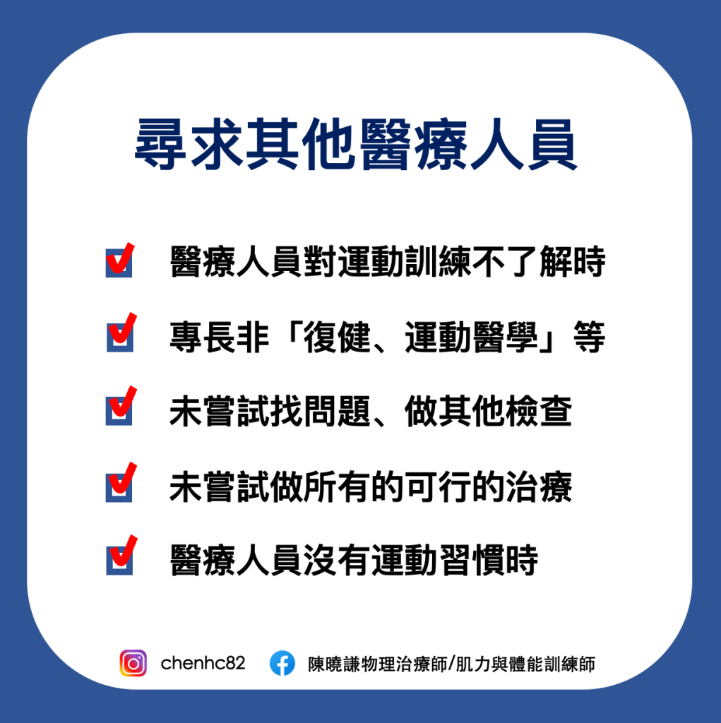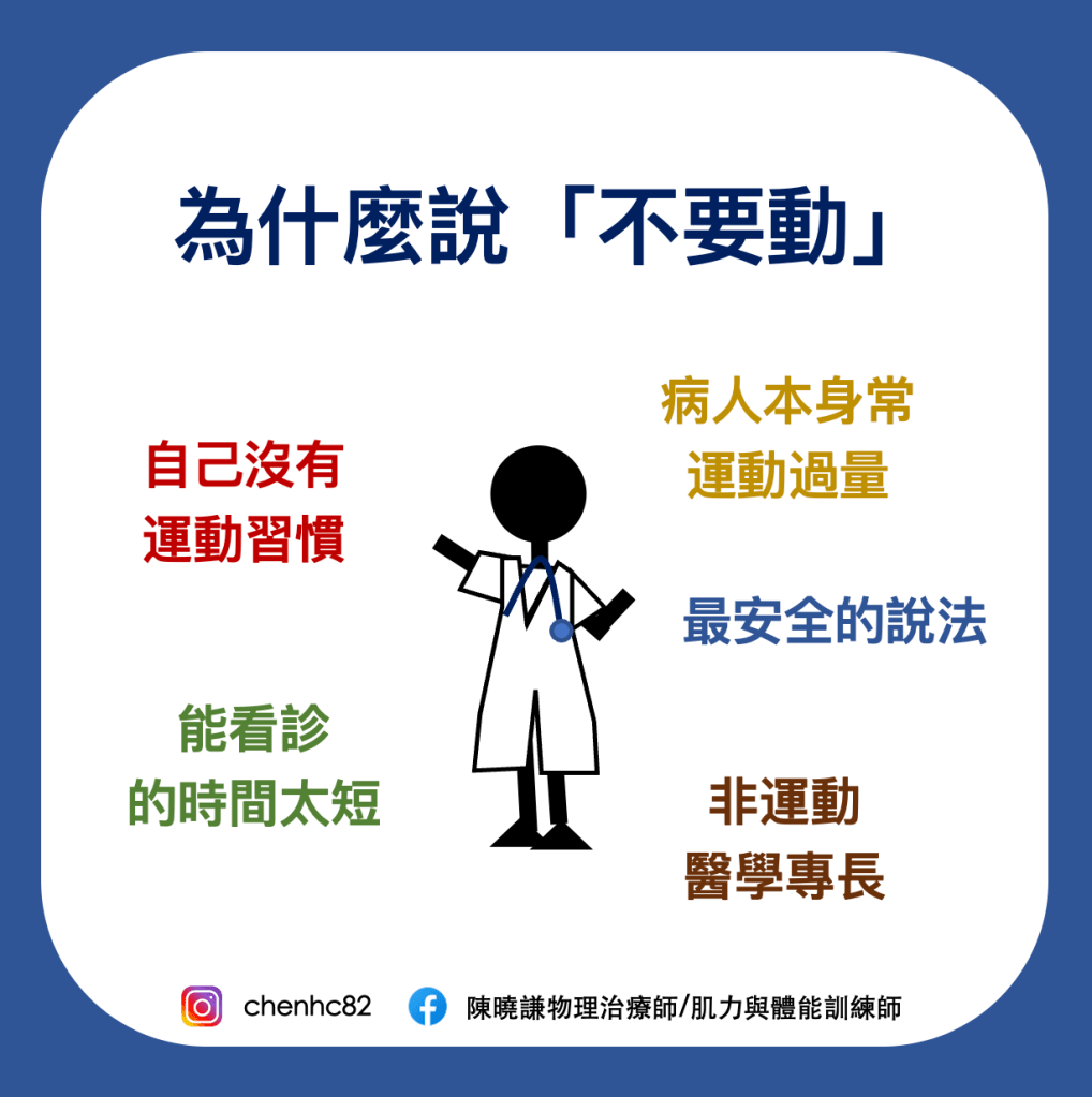 許多時候,當那位醫療人員不管是醫師、物理治療師,若自己沒有運動習慣,可能很難體會對運動的喜愛、帶來的益處。所以最簡單、省時減少疼痛跟傷害的方式就是叫你「不要動」,這聽起來很不負責任,但有時就是會遇到,尤其實在時間有限、病患量很多的時候