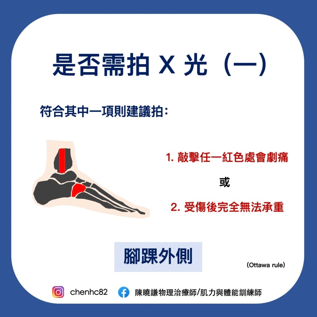 另外,運動醫學中有一個名叫Ottawa rule的檢測,用來判斷自己是否需要去醫院拍X光、做更進一步的檢查。主要是敲擊幾個常會骨折的部位、並看當下是否能走路為依據。因為若有骨折,光用手敲就會「爆痛」,而當下是否能走路,是因為當骨折時,把重力壓到受傷腳,一點壓力、受力同樣可以產生劇烈的疼痛。