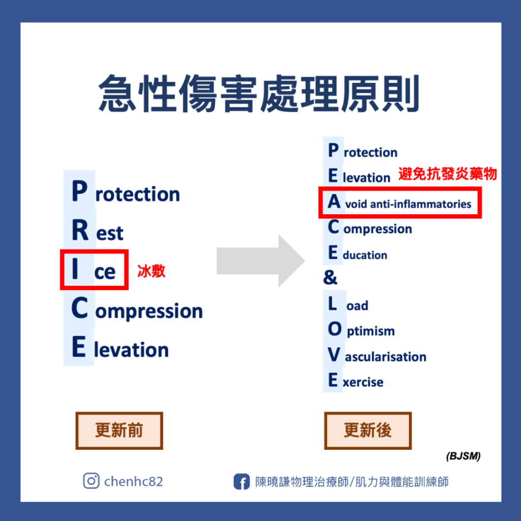 大約從兩年前開始,許多人就寫過類似的主題,主要是源自BJSM(英國運動醫學雜誌),將「急性運動傷害處理原則」由過去的POLICE原則,調整為PEACE & LOVE,而最讓人訝異的是將「冰敷(Ice)」的處置拿掉,改為「適當承重及活動(Optimal Loading)。民眾或許聽說大原則已經改了,但在實際受傷時,可能因為驚慌失措,或是因為疼痛、怕再受傷的關係,還是回到原本的處理方式如休息及冰敷,因此這篇文章是提供更多對於受傷後修復的觀點,讓大家可以判斷適不適合做冰敷。