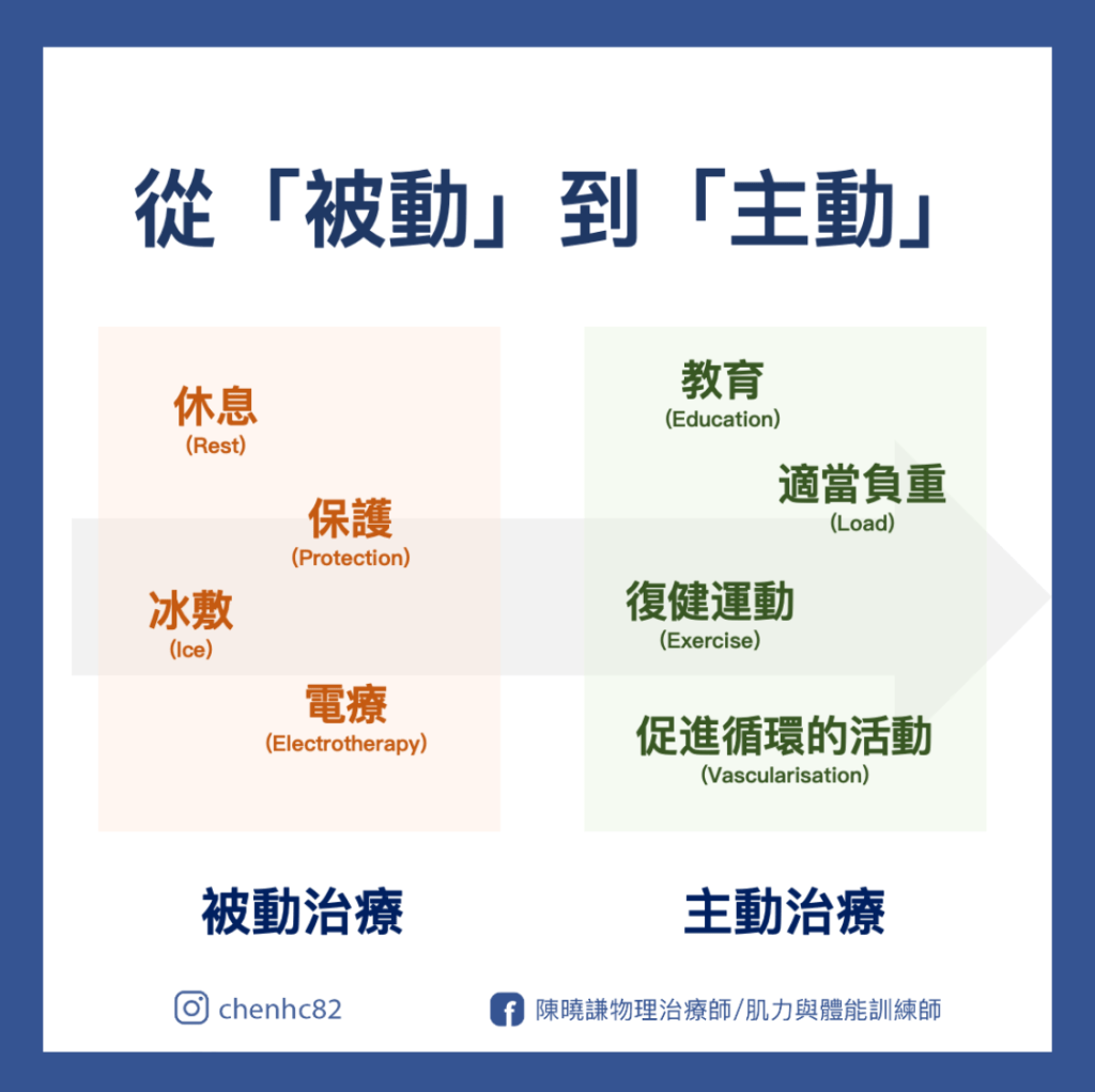 2020年BJSM將急性運動傷害處理原則中的冰敷(Ice)改為適當承重及活動(Optimal loading),我想就是在提倡主動治療(Active recovery)的好處。若要說哪種治療或處置效果最多、副作用最少,適當活動跟復健運動應該是名列前茅的。受傷後,在不會讓傷害加劇的情況下,適量活動患處,能促進血液循環、避免能力如肌力、平衡、本體感覺、關節活動度等變差,而這些都是休息過久、過度保護的後遺症。
