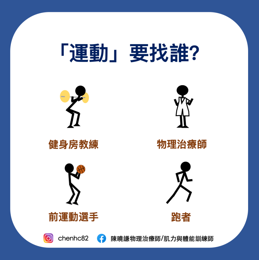會「運動」的人很多,從過去是運動員的人、健美專長的、馬拉松選手、帶中風患者走路的治療師、在社區帶長者團康的教練、奧運選手的教練、連鎖健身房的教練等。但在運動這個巨大的光譜中,每個人的專精的可能在其中一個範圍,依照每個人的養成教育、工作後的繼續教育等。