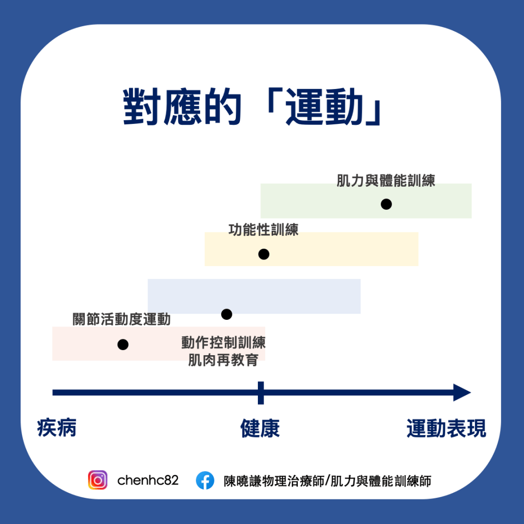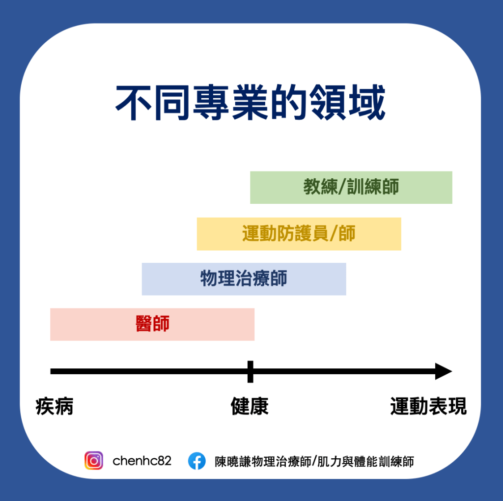 上述的技巧都有「運動、訓練」等字眼,但其背後的意義、使用的時機有大大的不同。這當中也涵蓋從醫療端到訓練端的一整個光譜。從受傷應進行的「復健」由物理治療師主導;適合各類族群的「功能性訓練」;準備回到運動場上前的基礎動作能力由運動防護員主導;進階的肌力與體能、運動表現則由教練主導。