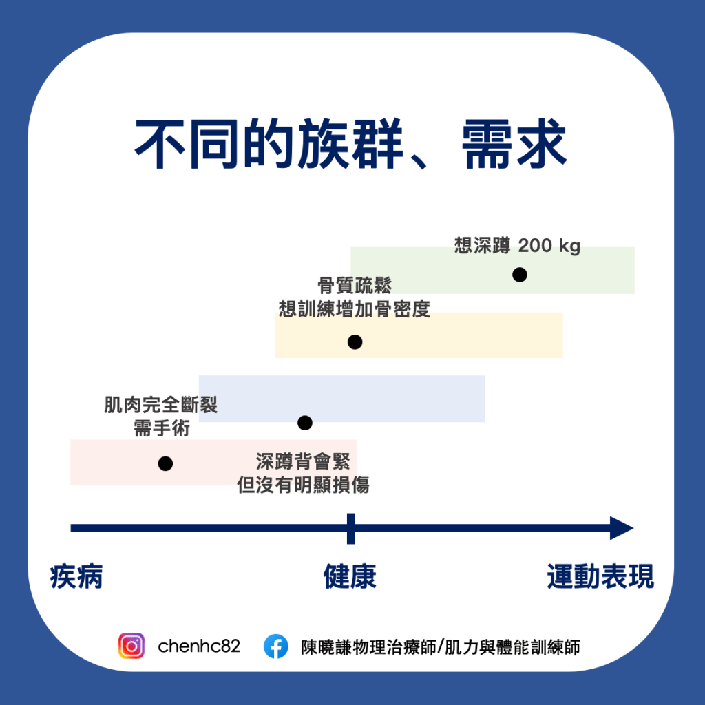 對病患、一般民眾、運動員,找到適合自身需求、專攻光譜中特定範圍的專業人員,才能更有效率的解決問題。例如,每次深蹲時,腰都會覺得緊緊卡卡的,重量遲遲上不去,可能需要找物理治療師進行「動作檢測、肌肉再教育、動作控制訓練等」。而復健半年的十字韌帶斷裂的籃球選手,日常生活、走、跑、跳都沒問題了,則應該轉由技術教練、肌力與體能訓練師進行「基礎重量訓練、爆發力、敏捷訓練等」。
