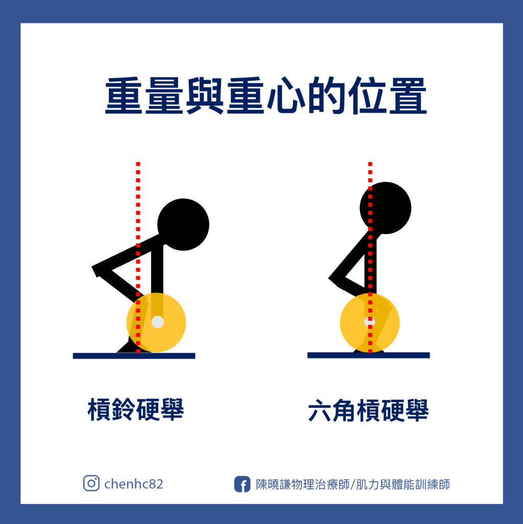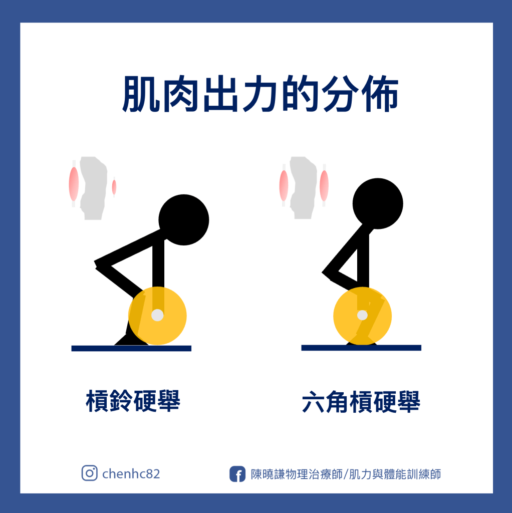 相較於槓鈴硬舉雙手是握在身體的前側,六角槓硬舉時雙手是握在身體的兩側,更能讓學員處在一個抬頭挺胸的姿勢,甚至對於駝背的人,還會半引導地將身體調整為更平衡的位置,因為身體前、後肌群的能更平均發力。其次,六角槓硬舉的設計讓重量跟身體的重心能幾乎完全地在同一直線上,當重量在身體的前側,我們會因為有一個被迫往前彎腰的力矩,我們後側的肌群會參與較多,也就是傳統槓鈴硬舉會有的情況,好處是能更誘發後側肌群的出力,但小缺點則是對於「剛從腰傷恢復、或正有下背痛」的患者,往前彎腰或舉起前方的重物,會是一個心理上的壓力,因此,六角槓的設計讓身體能保持更「直立」地來舉起重量,對下背痛的族群夠友善,但未來一定也是可以轉用傳統槓鈴進行訓練。